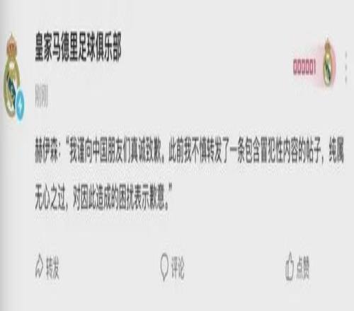 直到壓力無法回避,皇馬終于“行動”了。2月22日晚,皇馬官方微博發布了一則赫伊森的“道歉聲明”,全文中文,核心意涵只有四個字:“無心之過”。
