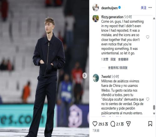 赫伊森的最新一條社媒是7天前,該條社媒評論數(shù)已經(jīng)超2.1萬條,眾多球迷要求赫伊森道歉。