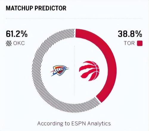 反觀猛龍,近期連續拿下實力不強的公牛和雄鹿,拿到2連勝。猛龍此前曾有不錯表現,近期球員狀態起伏,但他們的整體實力不差,面對弱隊足以取勝。上場比賽巴恩斯缺陣,英格拉姆得22分,奎克利爆發砍下32分9助攻,猛龍的主要問題在于外線得分不夠穩定。這場比賽雷霆得分前四的球員中有三人傷缺,球隊實力受損明顯,猛龍表現也不穩定,預計兩隊會進入膠著戰,不過,猛龍憑借主場優勢,有很大希望取勝。不過,ESPN的數據模型倒是看好雷霆,預測雷霆的勝率61.2%,猛龍勝率只有38.8%。