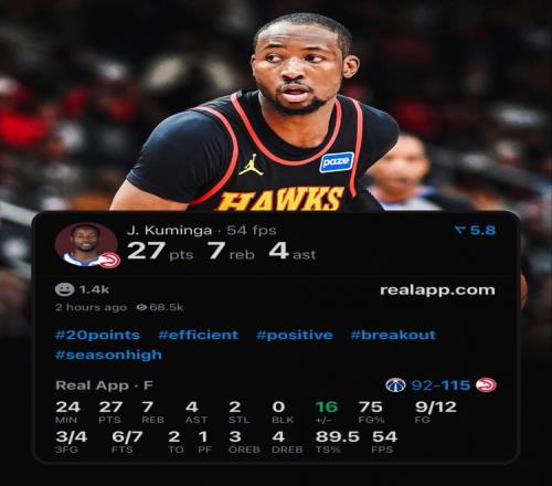 本場比賽,老鷹新援庫明加迎來首秀,他替補出戰24分27秒,12中9,其中三分4中3,罰球7中6,得到27分7籃板4助攻2搶斷,正負值+16。