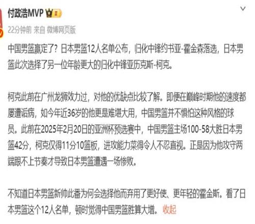 據媒體人付政浩的介紹:柯克此前在廣州龍獅效力過,對他的優缺點比較了解。即便在巔峰時期他的速度都屢遭詬病,如今年近36歲的他更是難堪大用,中國男籃并不懼怕這種風格的球員。此前在2025年2月20日的亞洲杯預選賽中,中國男籃主場100-58大勝日本男籃42分,柯克僅得11分10籃板,進攻能力菜得令人不忍直視。正是因為他攻守兩端跟不上節奏才導致日本男籃遭遇一場慘敗。