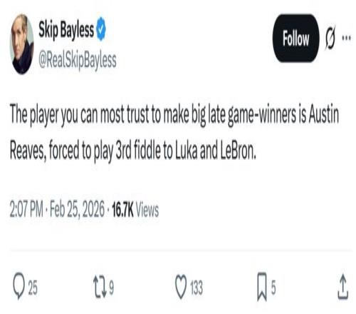 湖人名宿沃西也給出相同說法:“如果東契奇投射狀態不佳,或許湖人可以考慮讓里夫斯投絕殺球。”