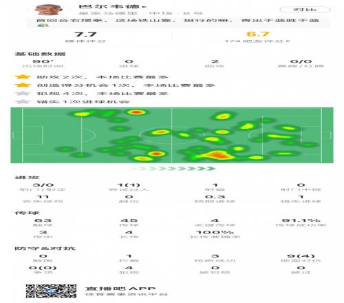 巴爾韋德全場數據:2助攻4關鍵傳球+傳球成功率91%,獲評7.7分