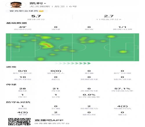 體育播報2月26日宣 尤文在歐冠附加賽次回合常規時間3-0領銜加拉塔薩雷,總比分5-5戰平進入加時賽,以下是凱利的全場數據。