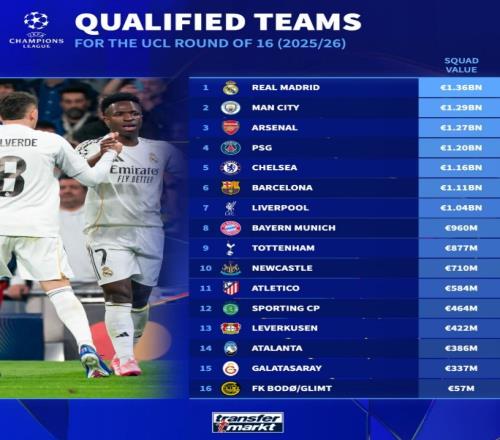 歐冠16強(qiáng)德轉(zhuǎn)身價(jià)榜:皇馬居首,曼城、阿森納、巴黎、切爾西前五