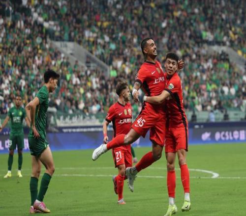 2025年9月21日,上海海港隊球員萊昂納多(右二)進球后慶祝。 當日,在北京工人體育場舉行的2025賽季中國足球超級聯賽第25輪比賽中,北京國安隊主場2比3不敵上海海港隊。 新華社記者 胡星宇 攝