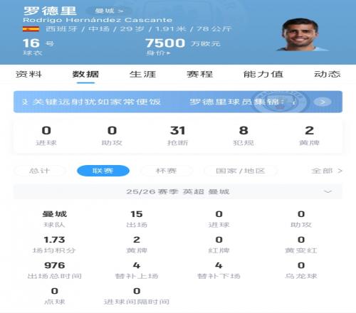 羅德里現年29歲,他本賽季受傷病困擾,為曼城出場22次,貢獻1球,他現身價7500萬歐,與曼城合同至2027年。
