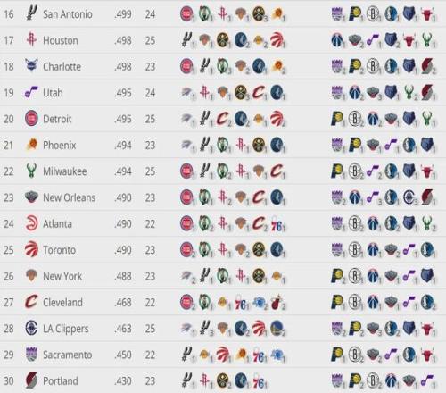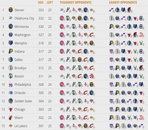 截至今天賽前,雄鹿26勝31負(fù)排名東部第11,落后第10的黃蜂1個(gè)勝場,落后第9的老鷹1.5個(gè)勝場。下面這張圖是聯(lián)盟剩余賽程的難度:掘金、雷霆、森林狼、奇才和灰熊排名前五。雄鹿僅排聯(lián)盟第22,剩余賽程算是比較輕松的。