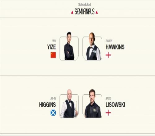 威爾士公開賽半決賽對陣:吳宜澤vs霍金斯,希金斯vs利索夫斯基