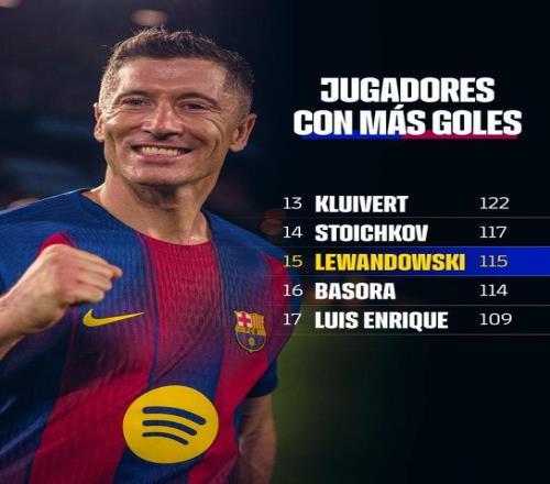 本場比賽,萊萬在傷停補時階段打進一球,根據(jù)統(tǒng)計,這是他代表巴薩打進的第115個進球,這也使得他超越巴索拉,獨占隊史射手榜第15名。