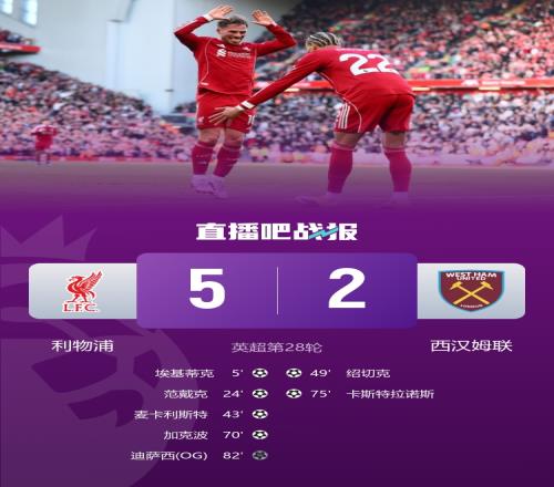 利物浦5-2西漢姆聯,各項賽事4連勝,利物浦本場多點開花。