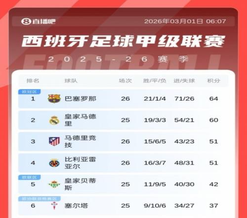 巴薩4-1戰勝比利亞雷亞爾,馬競1-0絕殺皇家奧維耶多。積分榜方面,巴薩暫4分優勢領跑。