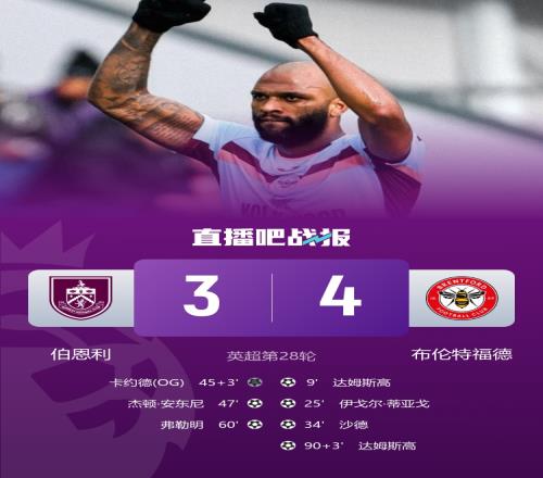 伯恩利3-4布倫特福德,本場伯恩利連丟3球后一度扳平,布倫特福德補時絕殺。本場比賽尾聲多次出現反轉劇本,堪稱跌宕起伏。