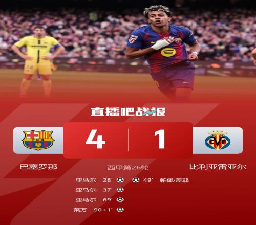 巴薩4-1比利亞雷亞爾先賽4分領跑。亞馬爾斬獲生涯首帽!萊萬補時破門。