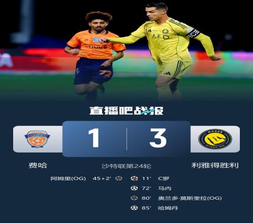 利雅得勝利客場3-1逆轉費哈,勝利取得聯賽10連勝,積61分位居榜首,領先第2名吉達國民2分。