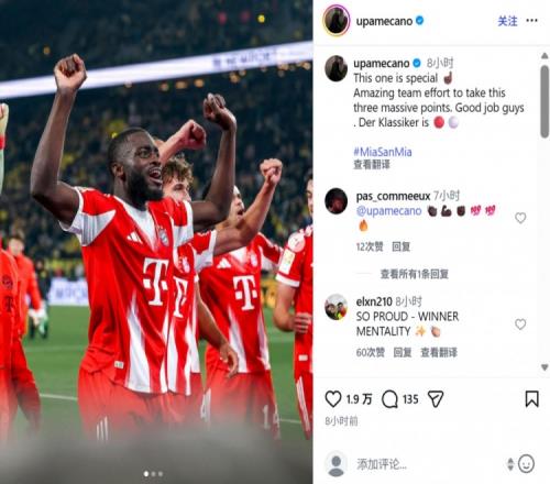 賽后拜仁后衛于帕梅卡諾在社媒曬出球隊慶祝勝利的照片,配文寫道:“這場勝利尤為珍貴,全隊付出不懈的努力收獲重要的三分!大家漂亮的完成任務!國家德比勝利屬于拜仁!”