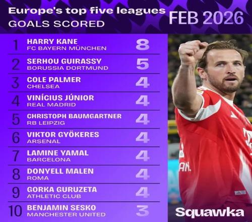 據Squawka統計,拜仁中鋒哈里-凱恩在2月的德甲聯賽中打入8球,高居五大聯賽射手榜之首。多特前鋒吉拉西打入5球,位居次席。