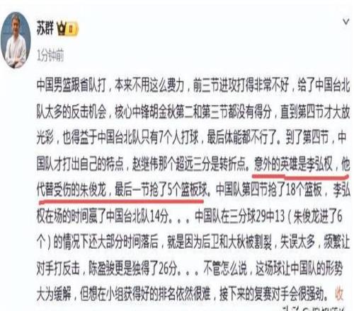 賽后蘇群夸他是意外的英雄。他發(fā)文寫道,“中國男籃跟省隊(duì)打,本來不用這么費(fèi)力,前三節(jié)進(jìn)攻打得非常不好,給了中國臺北隊(duì)太多的反擊機(jī)會(huì),核心中鋒胡金秋第二和第三節(jié)都沒有得分,直到第四節(jié)才大放光彩,也得益于中國臺北隊(duì)只有7個(gè)人打球,最后體能都不行了。到了第四節(jié),中國隊(duì)才打出自己的特點(diǎn),趙繼偉那個(gè)超遠(yuǎn)三分是轉(zhuǎn)折點(diǎn)。意外的英雄是李弘權(quán),他代替受傷的朱俊龍,最后一節(jié)搶了5個(gè)籃板球。”李弘權(quán)是中國隊(duì)今天最大的驚喜和英雄。你們說呢?