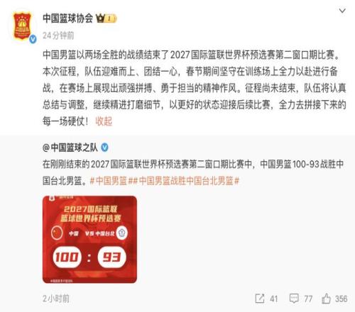男籃世亞預小組賽,中國男籃100-93戰勝中國臺北男籃。在比賽結束之后,男籃官方第一時間發布了關于這場比賽的一...