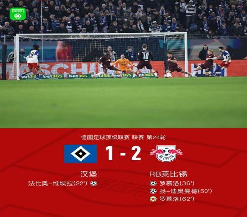 北京時間3月2日德國足球頂級聯賽 聯賽 第24輪,漢堡主場對陣RB萊比錫。漢堡法比奧-維埃拉破門。RB萊比錫羅慕洛破門,揚-迪奧曼德破門。最終比分漢堡 1-2 RB萊比錫。