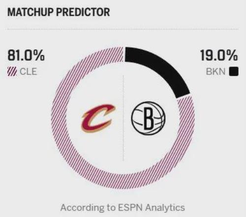 今日一戰,騎士的新核哈登迎來復出,米切爾將繼續缺陣。即便少了一位核心,騎士還有阿倫與莫布里的雙塔坐鎮,實力依舊占據明顯上風。不出意外,騎士有望在客場輕松拿下比賽,終結連敗頹勢。賽前,ESPN給出本場勝率預測,騎士高達81%,籃網只有19%。