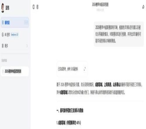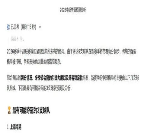 Deepseek認(rèn)為,上港僅被扣5分,追分壓力較小,球隊(duì)陣容穩(wěn)定且補(bǔ)強(qiáng)得當(dāng),同時(shí)開局階段對手實(shí)力補(bǔ)強(qiáng),賽程相對友好。因此,他們成為最有可能奪冠的球隊(duì)。
