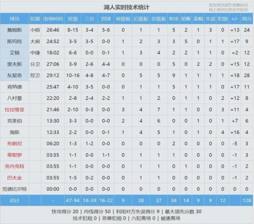 三節戰罷,湖人96-76領先整整20分。詹姆斯前三節11中5得到14分,第四節4中3砍下10分。最后半節雙方換上純替補陣容,全場結束,湖人128-104大勝國王24分,背靠背取得2連勝。東契奇28分5板9助、詹姆斯24分5助2斷。