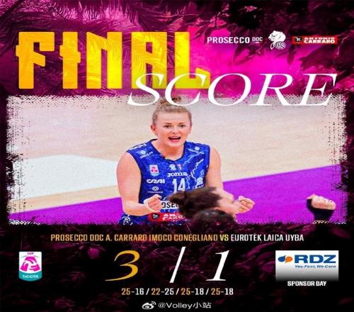 意大利女排聯賽1/4決賽為三場兩勝制,此役過后,科內1-0領先。