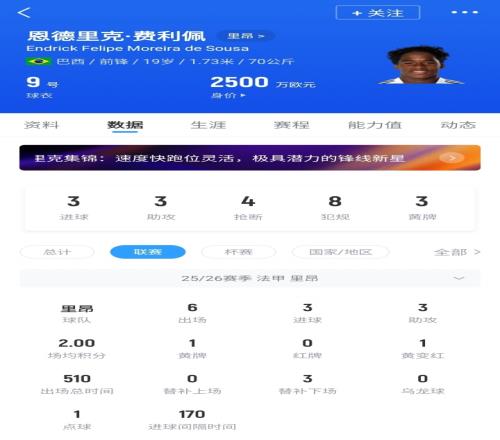 目前恩德里克6場全部先發(fā),租借費已經(jīng)減免20萬歐。