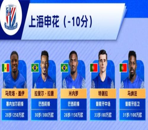 上海申花五外援:蓋伊250萬歐、拉唐300萬歐、米內羅150萬歐、馬納法100萬歐、特謝拉80萬歐,外援總身價880萬歐