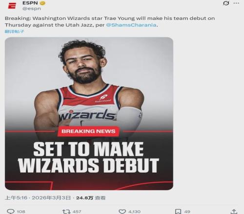 北京時間3月3日上午,據(jù)NBA名記Shams報道,特雷楊將在本周五主場對陣爵士的比賽中迎來奇才生涯首秀。奇才主教練布萊恩-基夫印證了這一報道:特雷楊預(yù)計(jì)在首秀時出戰(zhàn)17-20分鐘。因腿部傷勢,2026年特雷楊還沒有出戰(zhàn)過。