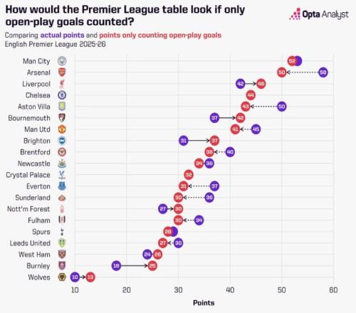 ▲如果僅計算運動戰進球,英超聯賽的排名表變化。
