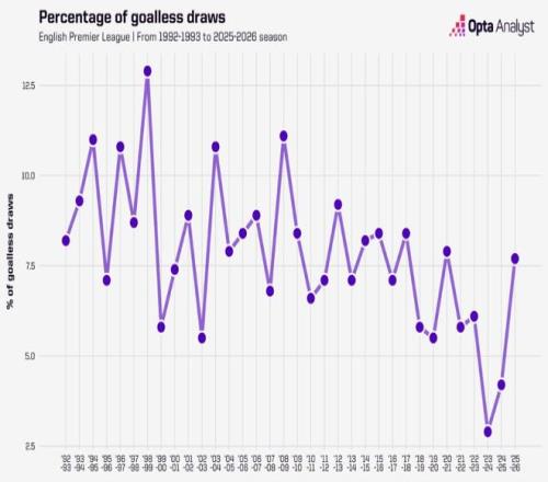 過度看重定位球戰術,導致英超0比0比賽數量上升。本賽季英超已有19場0比0的比賽,超過2024/25賽季(16場)和2023/24賽季(11場),白卷比賽占比(6.8%)也連續3個賽季上升。白卷場次增加與進球數下降正向相關,各隊癡迷定位球得分,導致射門數也在下降。本賽季場均射門次數(24.4次),是2003/04賽季以來第二低,僅高于2020/21賽季(場均24.2次)。那個賽季因疫情,大部分比賽球員發揮都低于預期。