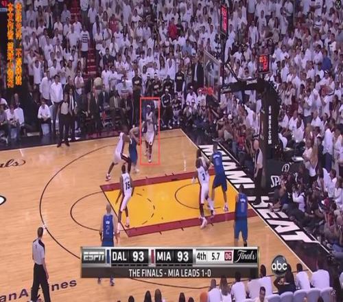 諾維斯基運了兩次球,一個背轉身連接一個小小的后撤步,重心向后拉,這個小連招是諾維斯基要施展金雞獨立前的預備動作!波什果然上當,他的重心向前一偏,諾維斯基馬上低頭運了一下球就往籃下沖,哐哐兩大步沖到禁區,使用受傷的左手上籃打進!絕殺!小牛不可思議地逆轉絕殺了熱火!換個角度再來一張照片。