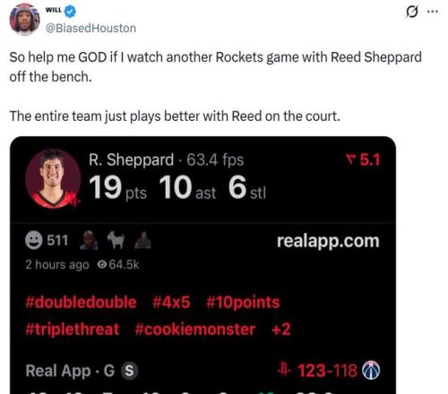 火箭媒體人BiasedHouston也果斷發文力挺謝潑德:“如果謝潑德再替補作戰,我絕對不會再看火箭隊比賽,他在場時火箭隊表現明顯更好。”