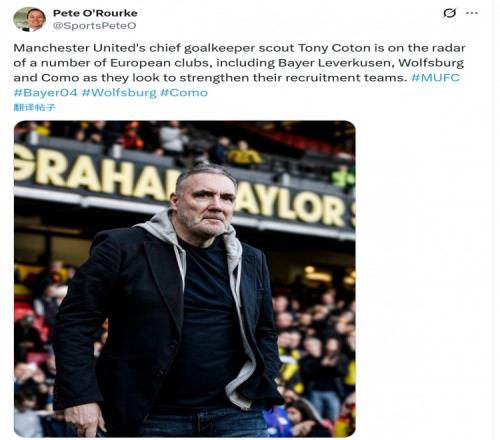 Pete O'Rourke透露,曼聯首席門將球探托尼·科頓受到多家歐洲俱樂部的關注,包括勒沃庫森、沃爾夫斯堡、科莫,這些俱樂部正尋求加強引援團隊。