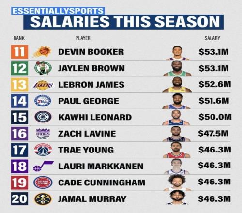 NBA本賽季球員年薪榜發布!庫里第一4.12億元!詹姆斯跌出前十