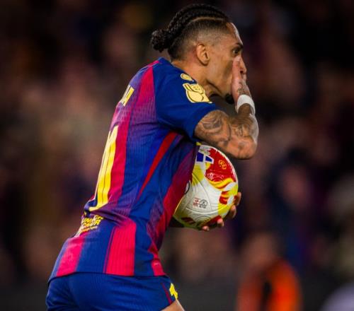 半場結束前,佩德里在禁區內被放倒,裁判果斷判罰點球。拉菲尼亞操刀,輕松騙過穆索,弗里克實現了半場追回兩球的目標。