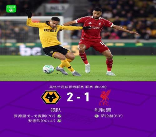 北京時(shí)間3月4日4:15,英超第29輪展開爭奪,利物浦做客莫利諾克斯球場挑戰(zhàn)狼隊(duì),本場主裁判為湯姆-布拉摩爾。上半場,雙方均未能形成威脅攻門。下半場,羅德里戈-戈麥斯打破僵局,薩拉赫扳平比分,安德烈補(bǔ)時(shí)階段完成絕殺。最終,利物浦客場1-2不敵狼隊(duì)。