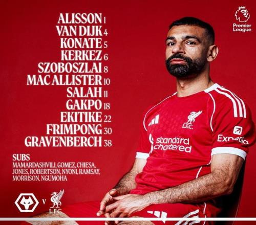 利物浦首發(fā):1-阿利松、30-弗林蓬、4-范戴克、5-科納特、6-凱爾凱茲、38-赫拉芬貝赫、8-索博斯洛伊、10-麥卡利斯特、11-薩拉赫、18-加克波、22-埃基蒂克