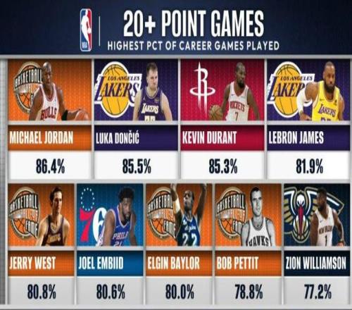 此外,東契奇還創(chuàng)下了NBA歷史第2的神跡。數(shù)據(jù)顯示,NBA歷史20+場數(shù)占比:邁克爾喬丹以86.4%獨居第1,東契奇(85.5%)高居第2、杜蘭特(85.3%)第3、詹姆斯(81.9%)排名第4。