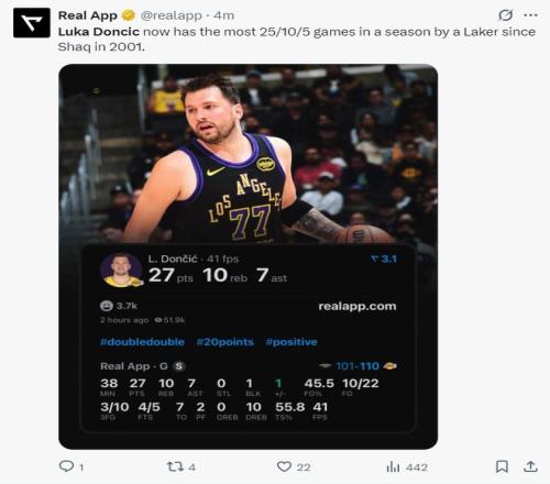 東契奇此役再度創造紀錄,在2026年東契奇20次20+5+5聯盟第一,單賽季14次拿到25+10+5是湖人隊史2001年奧尼爾后首人。