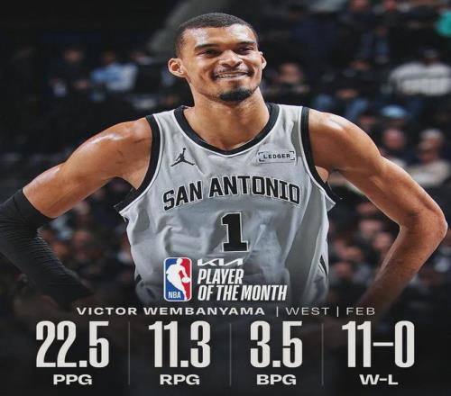 剛剛過去的2月份,馬刺11勝0負,聯盟最佳戰績,文班亞馬場均22.5分11.3籃板3.5蓋帽。全明星之后文班一共送出26記蓋帽,籃網全隊只有24記蓋帽,雄鹿全隊23記蓋帽。哈珀在2月份場均12.5分3.9籃板4.9助攻,投籃命中率55.4%。