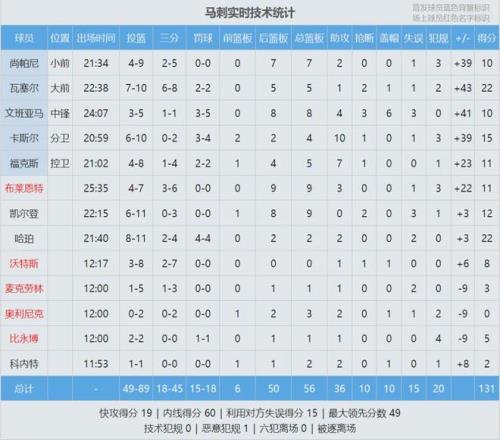 瓦塞爾出戰23分鐘,投籃10中7,三分8中6,罰球2中2,砍下22分5板1助2斷1帽,正負值+43全場最高。瓦塞爾+43高居隊史第二,僅次于鄧肯的+45。哈珀22分2板2助、卡斯爾15分4板10助、文班亞馬10分8板4助3斷6帽。