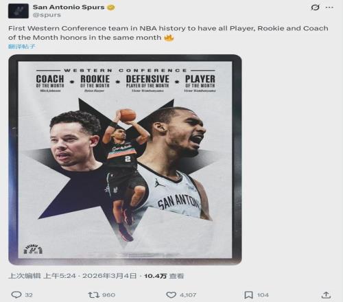 此外,文班亞馬和德里克-懷特分別當選西部和東部二月份最佳防守球員?!霸伦罴逊朗厍騿T”是從2024-25賽季開始設立的一個新獎項,但月最佳球員、教練和新秀的獎項由來已久。馬刺成為NBA史上第一支包攬西部這三大獎項的球隊。