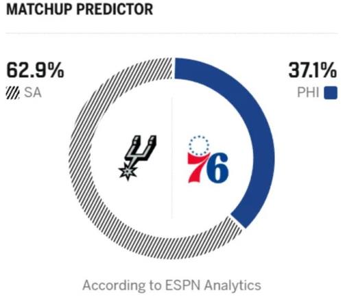 北京時間3月4日,NBA常規賽繼續進行,76人主場迎戰馬刺!馬刺上場比賽89-114慘敗尼克斯,3月開門黑,11連勝也被終結,43勝17負的戰績位列西部第二。那一戰,文班亞馬拿下25分13籃板,但三分7投僅 1 中,還出現7次失誤。馬刺整體三分手感冰涼,全場34次三分出手僅命中9球,除文班亞馬外,僅有瓦塞爾和卡斯爾得分上雙,球隊整體表現難言理想。而76人上場比賽同樣被凱爾特人終結連勝,33勝27負的戰績位列東部第六!恩比德上一場缺陣,馬克西空砍33分6助攻,埃奇庫姆拿到23分,其余球員表現平平。德拉蒙德中規中矩貢獻10分12籃板,巴洛有14分8籃板入賬,烏布雷10投僅2中,替補席四人合計僅得14分。目前 76 人陣容深度一般,喬治被禁賽,恩比德打打停停,確實傷害球隊。此役,恩比德繼續缺陣,賽前,美媒ESPN預測本場比賽,馬刺勝率62.9%,76人勝率37.1%。