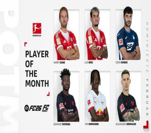 北京時(shí)間3月4日,德甲官方公布了德甲2月最佳球員候選,其中凱恩、迪亞斯領(lǐng)銜,揚(yáng)-迪奧曼德、卡巴克、塔普索巴、格里馬爾多在列。