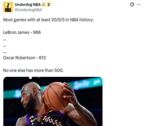 同時這是詹姆斯生涯第966場至少拿到20分5板5助,NBA歷史斷檔第一,大O以613場排在第二,兩人也是NBA歷史上唯二至少500場拿下20+5+5的球員。