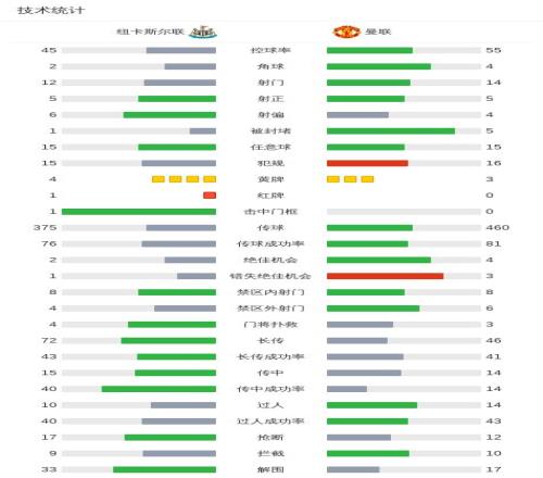 第64分鐘,紐卡眾將投訴對方禁區內手球,主裁判未予判罰