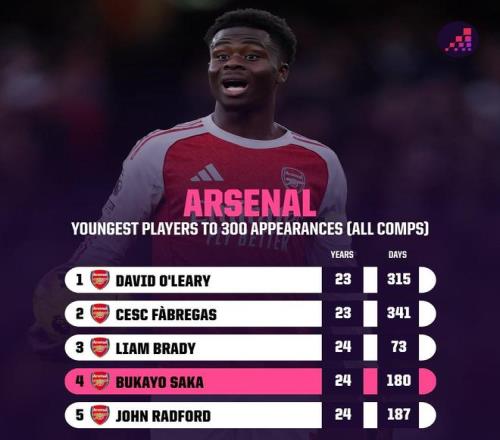 24歲180天,薩卡是達成阿森納生涯300場第四年輕的球員
